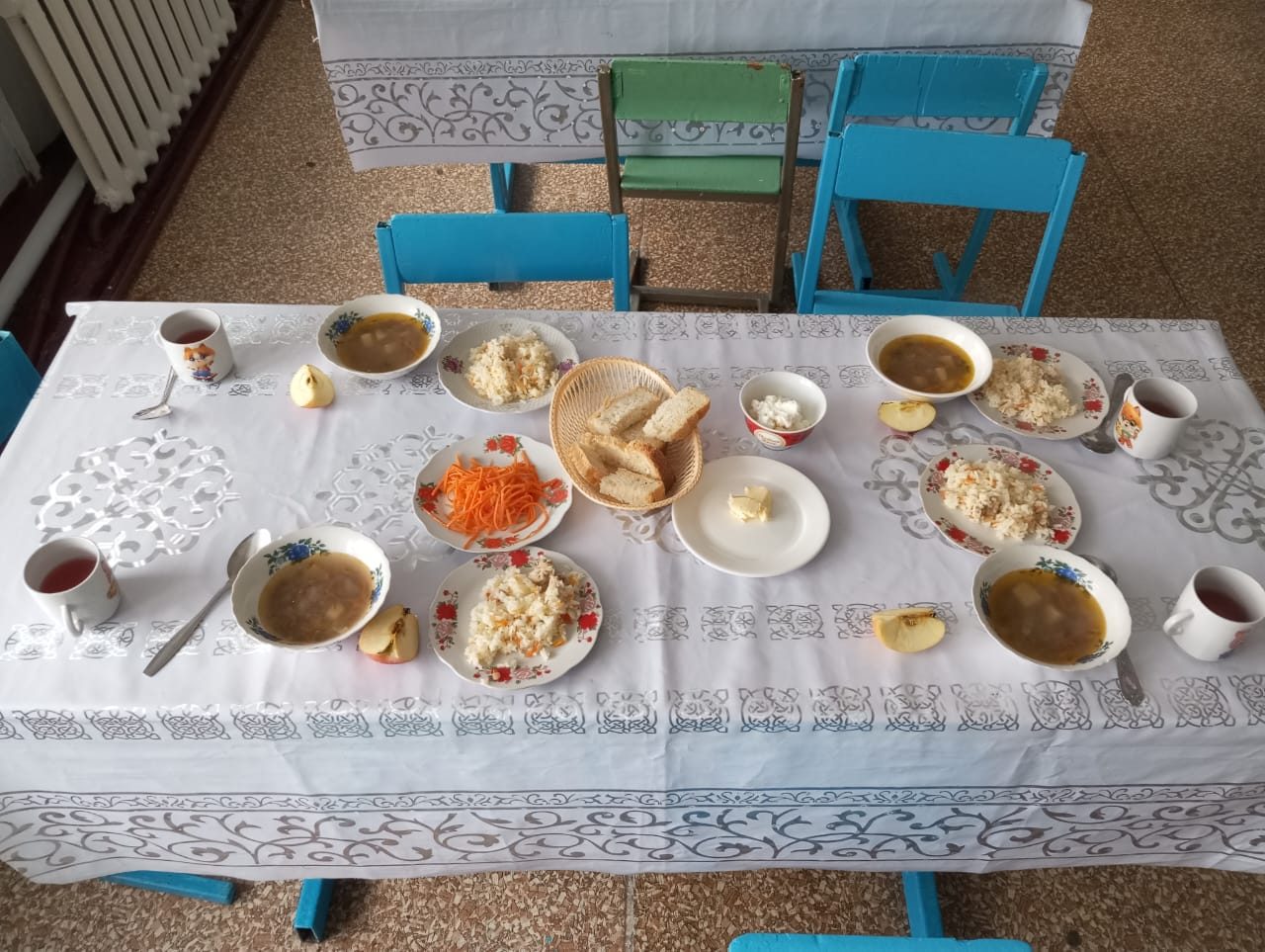Салат морковный 60 100 Суп гречневый 200 250 Плов 100 100 Кисель 200 200 Сузбеще 100 100 Яблоко 100 100 Хлеб с маслом 35/20 35/20