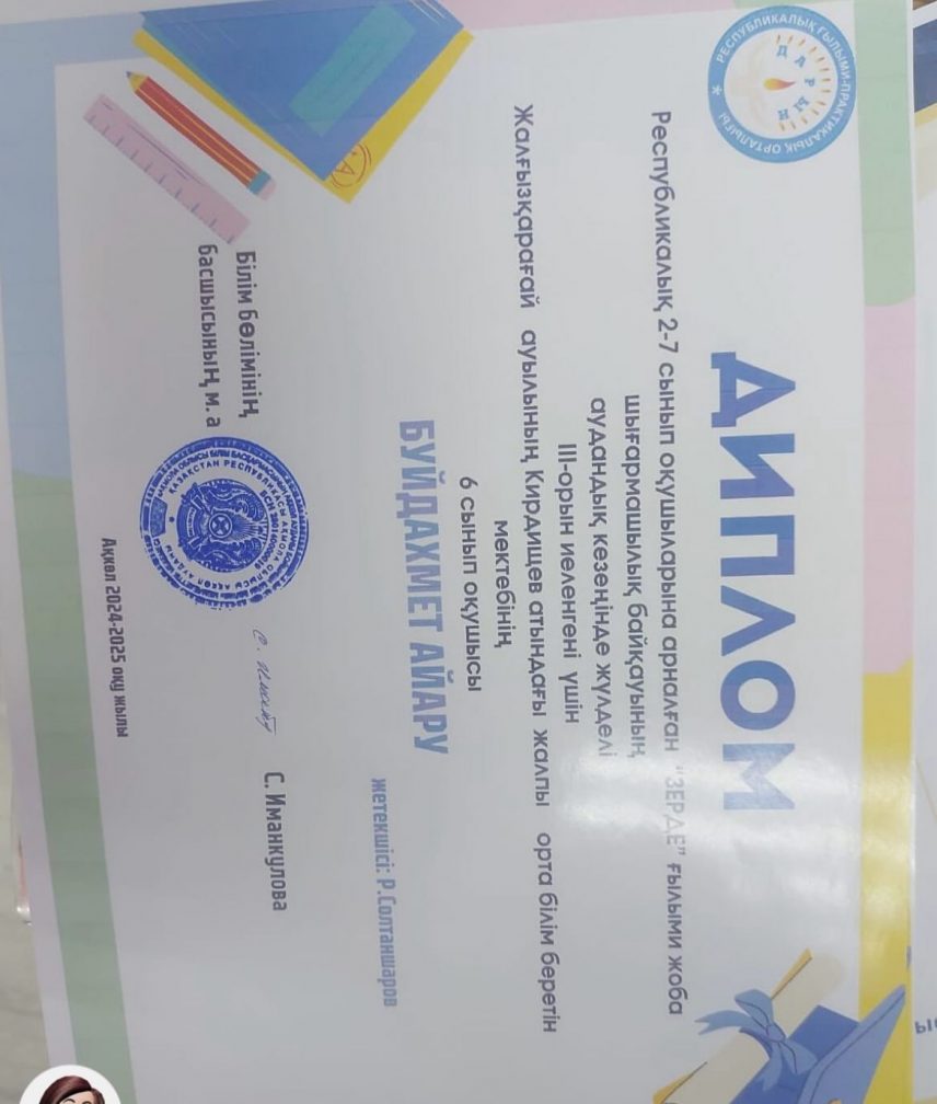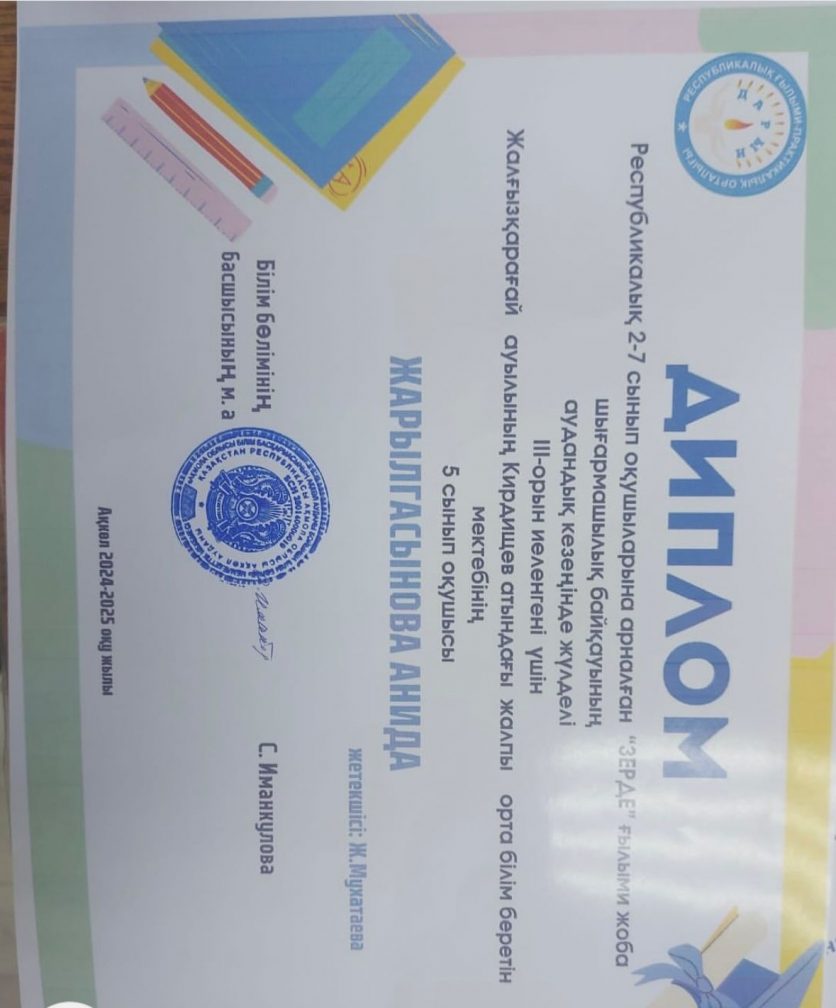Республикалық 2-7 сынып оқушыларына арналған “Зерде” ғылыми жоба шығармашылық байқауының аудандық кезеңінде жүлделі ІІІ-орын иеленгені үшін Жалғызқарағай ауылының Кирдищев атындағы жалпы орта білім беретін мектебінің 5 “А” сынып оқушысы Жарылгасынова Анида және 7”А” сынып оқушысы Буйдахмет Айару марапатталды.Құттықтаймыз! Жетекшісі: орыс тілі пәні мұғалімі Мухатаева Ж.М. Жетекшісі: тарих пәнінің мұғалімі Солтаншаров Р.